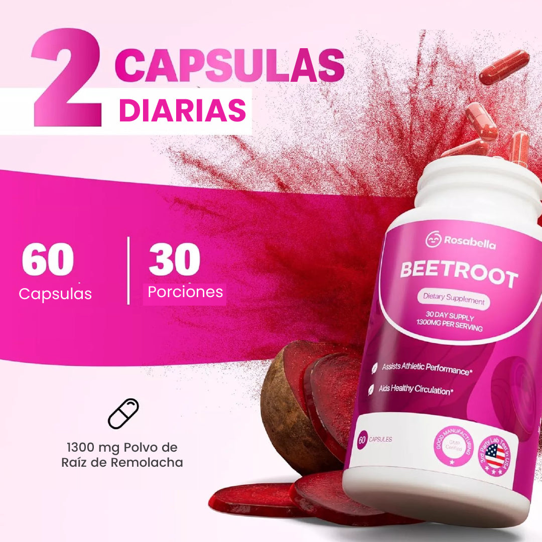 Beetroot dilata tus vasos sanguíneos, mejora el flujo y lleva más oxígeno a tu cuerpo, siente el cambio real desde la primera semana con solo 2 cápsulas al día.