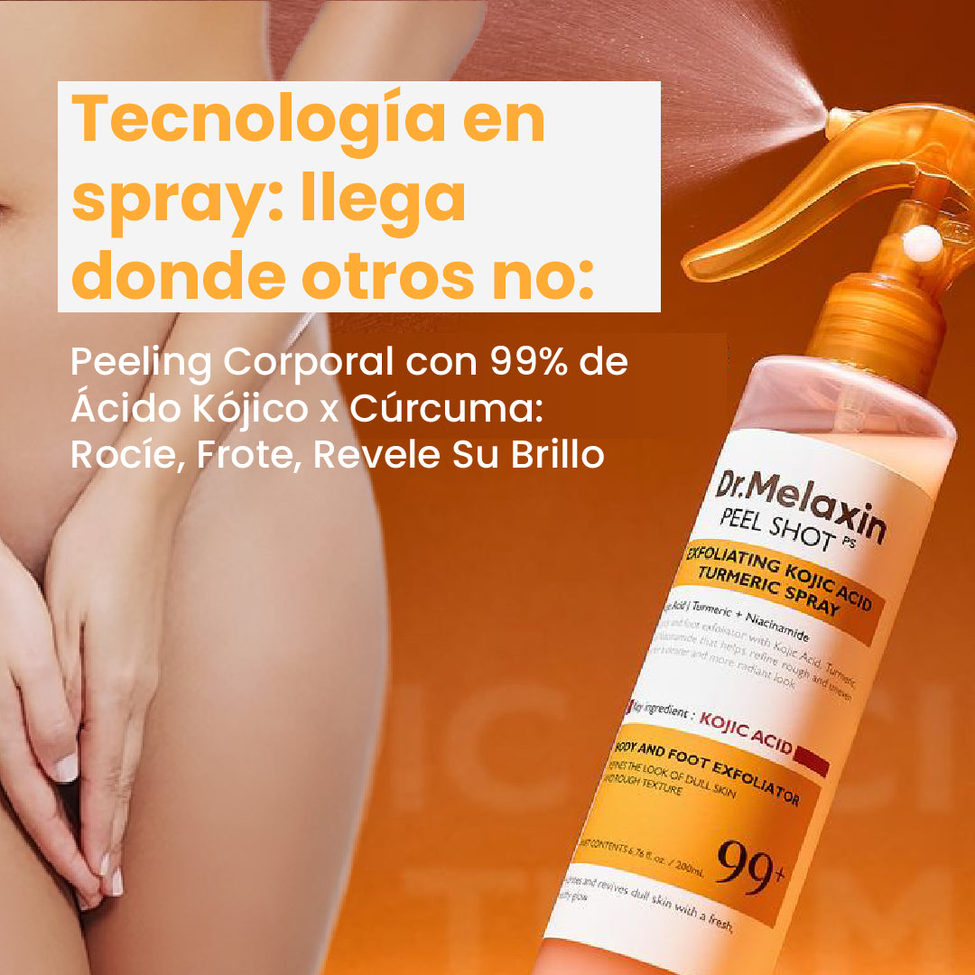 Olvídate de los exfoliantes abrasivos. Con Dr. Melaxin Body Peel Shot, tu piel se renueva y se aclara visiblemente desde la primera semana. Su fórmula con ácido kójico y cúrcuma actúa directo sobre las manchas oscuras, revelando una piel más limpia, pareja y luminosa.