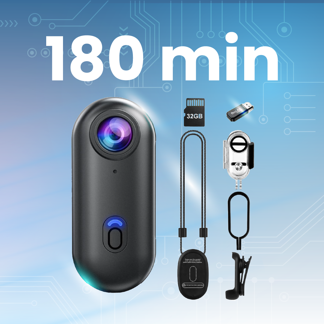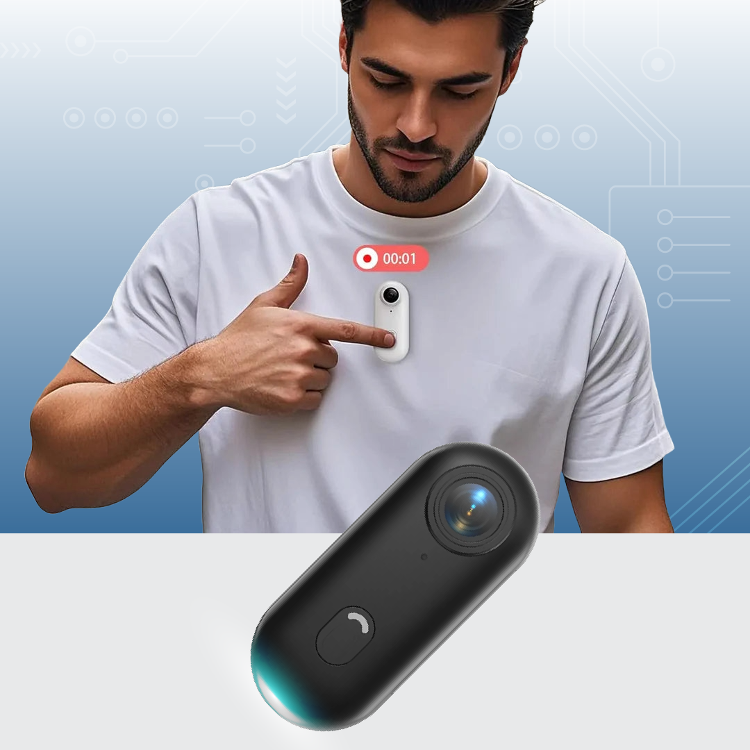 Más pequeña que tu pulgar, pesa solo 1.25 oz, resiste agua y graba hasta 150 minutos sin parar.
